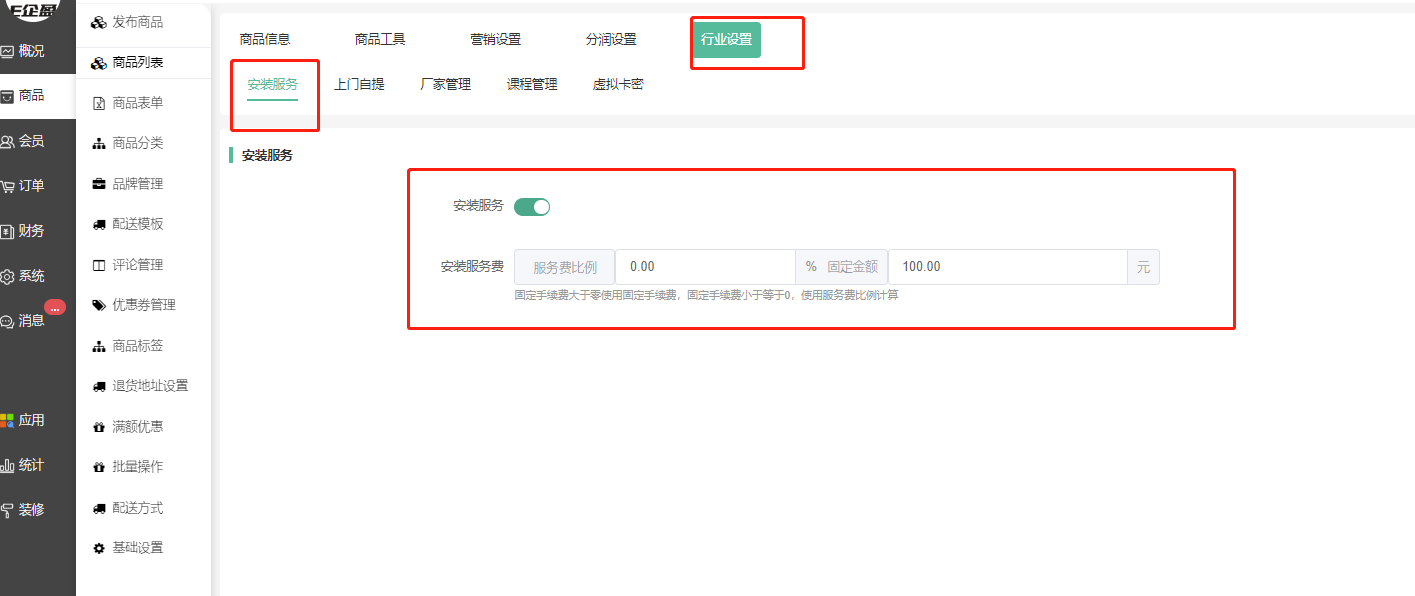 1.在商城商品发布商品中-行业设置-安装服务中开启按钮-填写好安装服务费