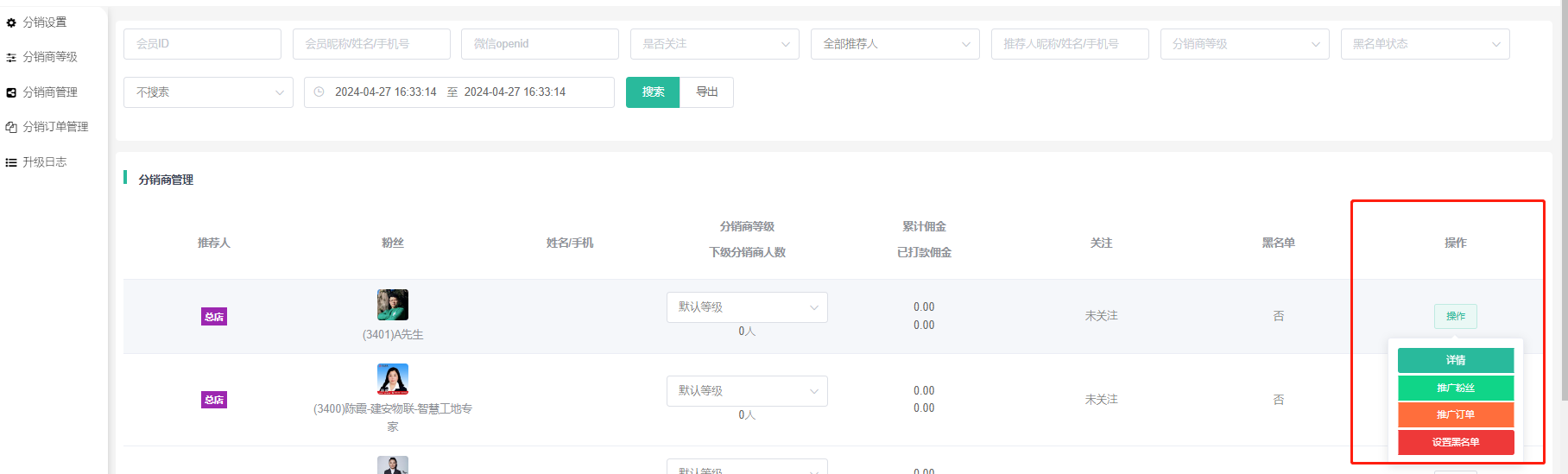 管理--操作可查看会员信息/详细信息/推广订单/推广粉丝/设置黑名单