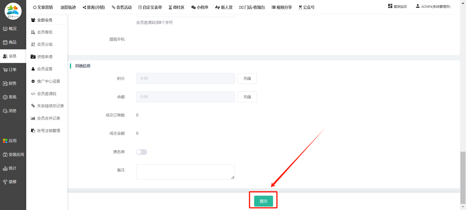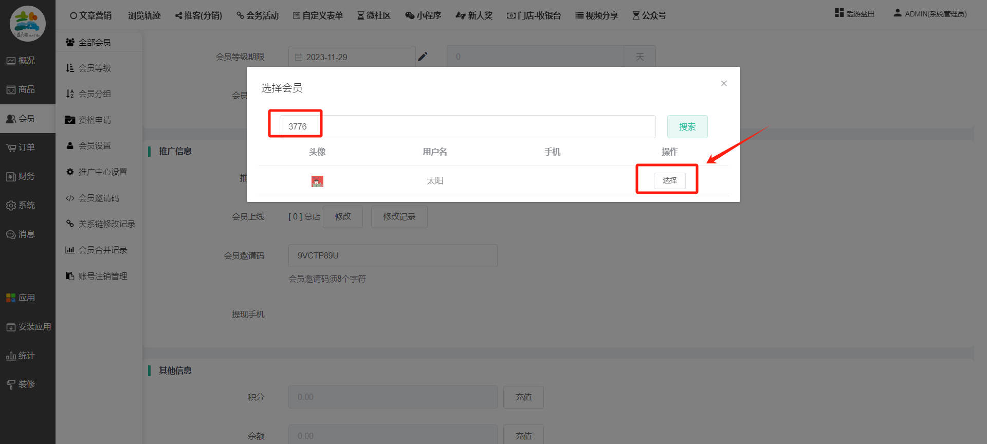 目录 搜索 展开 一、前期准备资料二、数字乡村码-上线操作指南1、服务号的申请流程及认证2、申请小程序流程3、开放平台绑定小程序和公众号三、数字乡村码-系统操作数字乡村码系统管理-概况数字乡村码-商品管理1、发布商品2、商品列表3、商品表单4、商品分类5、品牌管理6、配送模板7、评论管理8、优惠券管理9、商品标签10、退货地址设置11、满额优惠12、批量操作13、配送方式14、基础设置15、商品隐藏四、数字乡村码-会员管理1、全部会员2、会员等级3、会员分组4、资格申请5、会员设置6、推广中心设置7、会员邀请码8、会员关系链修改关系链修改记录9、会员合并记录10、账号注销管理11、会员设置中心五、数字乡村码-订单管理1、订单管理列表2、订单处理流程3、订单状态4、订单修改价格5、订单退款退货6、多包裹发货7、批量发货订单操作步骤8、催发货订单9、物流查询六、数字乡村码-财务管理1、余额设置2、会员余额3、充值记录4、转让记录5、余额明细6、收入明细7、提现设置8、提现统计9、积分管理10、转账审核11、收益广告12、批量充值七、数字乡村码-系统管理1、商城入口2、商城设置①、商城设置②、订单设置③、物流查询④、短信⑤、联系方式⑥、分类⑦、优惠券⑧、分享⑨、幻灯片⑩、广告位⑫、地图设置3、交易设置4、微信模板消息自定义消息模板(新版)自定义消息模板(旧版)小程序消息模板公众号模板消息变更公告5、语言设置6、权限管理7、多媒体管理八、数字乡村码-消息管理九、数字乡村码-应用管理十、数字乡村码系统-数据统计十一、数字乡村码-页面装修DIY1、模板管理2、店铺页面3、顶部导航4、底部导航5、DIY模板市场6、首屏广告7、基础设置8、装修DIY尺寸建议十二、供应商功能插件操作指南1、供应商2、门店-收银台门店申请和使用步骤门店管理①、门店-收银台 营销设置②、门店-收银台 分润设置门店分类门店申请门店审核门店商品门店商品订单收银台订单数据统计核销员基础设置默认设置门店装修3、微社区4、会务活动十三、营销插件操作指南活动报名提货卡新人奖微店问卷调查积分视频分享1、视频分享基础设置2、视频分享发现管理3、视频分享分类管理4、视频分享评论管理5、视频分享分红记录6、视频分享短视频中心每日红包幸运大抽奖签到优惠券二维码任务奖励优惠劵文章音频文章付费文章限时购新海报拓客卡操作流程积分活动素材中心视频红包十四、入驻门店应用类1、门店预约2、附近商品3、门店定位设置4、门店控制5、门店满额包邮6、门店满额减7、导入商品8、门店搜索9、门店股东10、核销券11、多门店核销1、商城后台设置2、前端功能演示十五、常见问题1、后台登录密码修改流程2、会员-余额,积分,后台如何进行充值与扣除3、如何修改上下级关系4、一种万能的获取商城小程序路径的方法 暂无相关搜索结果! 阅读次数:2163 本文档使用 模王系统 发布 8、会员关系链修改 8、会员关系链修改一.如何修改上下级关系?1.会员-全部会员-可以通过搜索用户的独立ID,或者用户微信昵称,找到此会员,然后点击右边的(操作)2.再点击会员详情。3.滑到下面,有个推广信息-会员上线,点击修改4.输入上级的ID号,点击搜索,出来此上级会员后点击选择。5.滑到最下面,一定要点击提交按钮。文档更新时间: 2023-11-30 14:56 作者:链上旅行