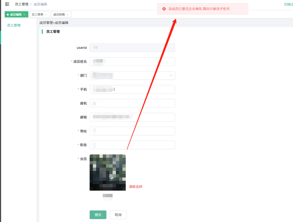 问题2:添加员工,提示该成员已激活企业微信,需自行修改手机号。