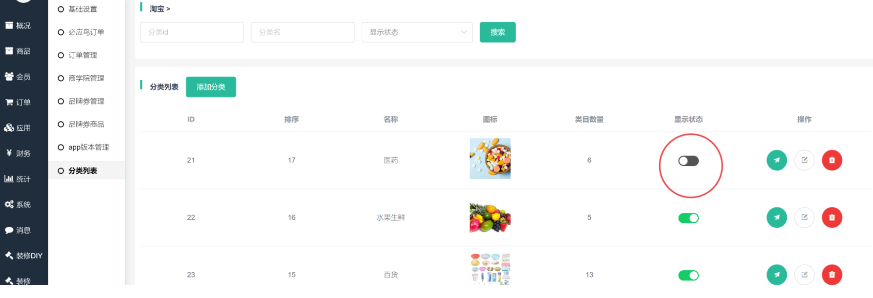 重要提示:初始化数据中包含药品类数据,如您不具备药品经营许可,请务必在初始化数据后删除药品相关类目数据,否则可能导致应用上架审核失败。在淘宝、拼多多两个大类下都存在医药类分类,可直接关闭显示状态即可!