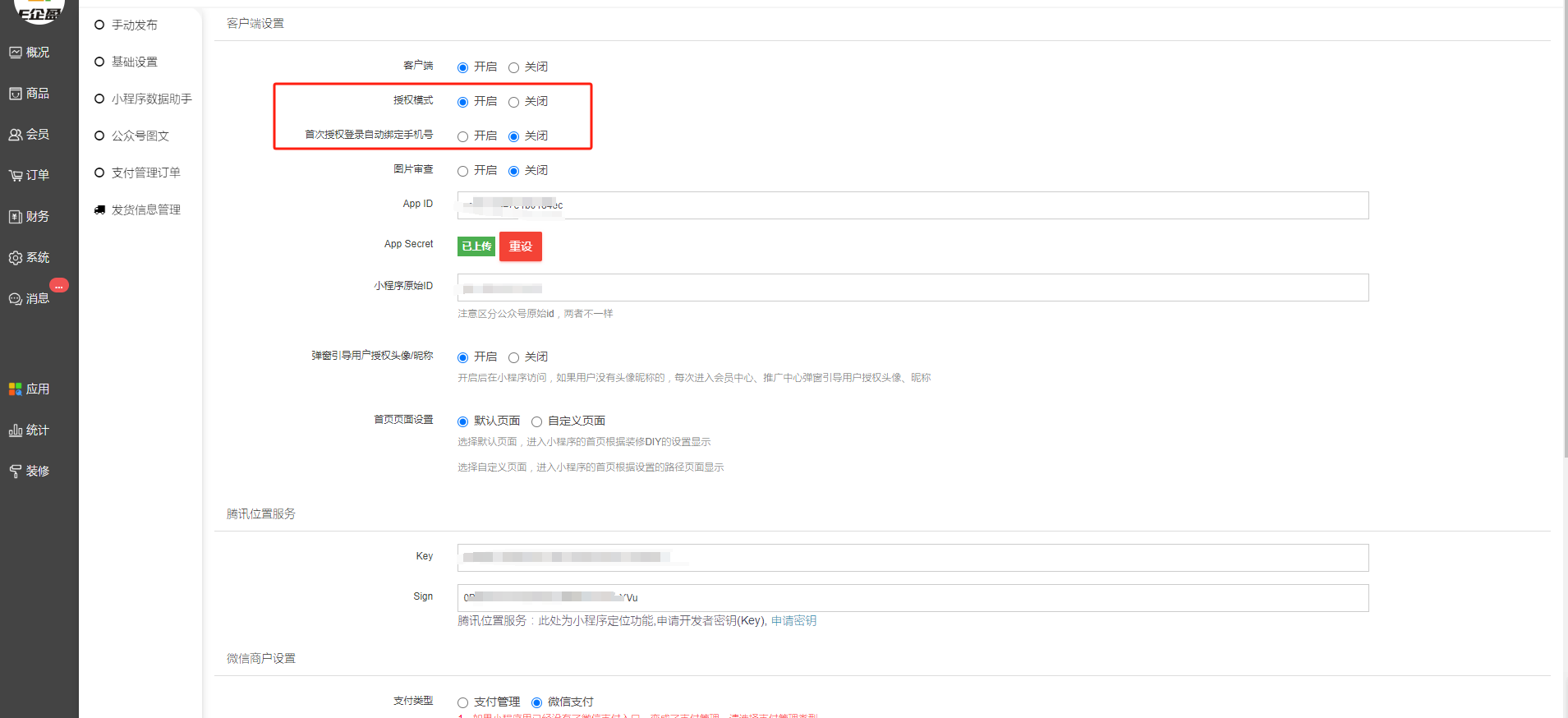 系统后台-应用-小程序-授权模式开启--手机号关闭