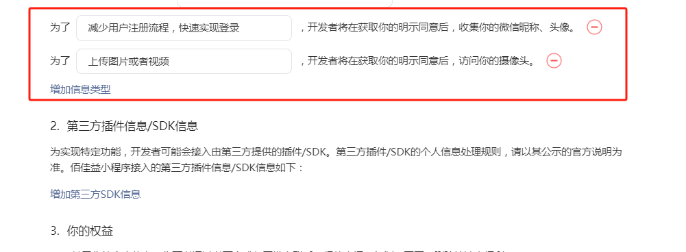 4、为了上传图片或者视频,开发者将在获取你的明示同意后,访问你的摄像头。(必选,不然会影响小程序点击授权登录无反应)